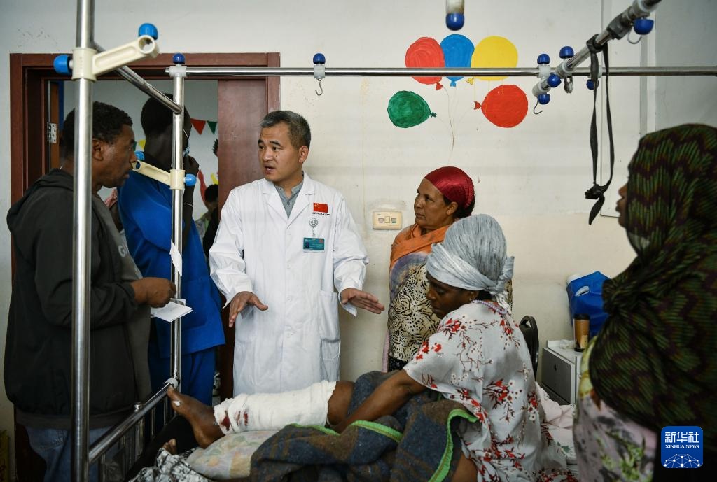 2月14日,在位于埃塞俄比亚首都亚的斯亚贝巴的蒂鲁内什-北京医院,中方骨科医生尚晨光与当地医生一起查房。新华社记者 韩旭 摄