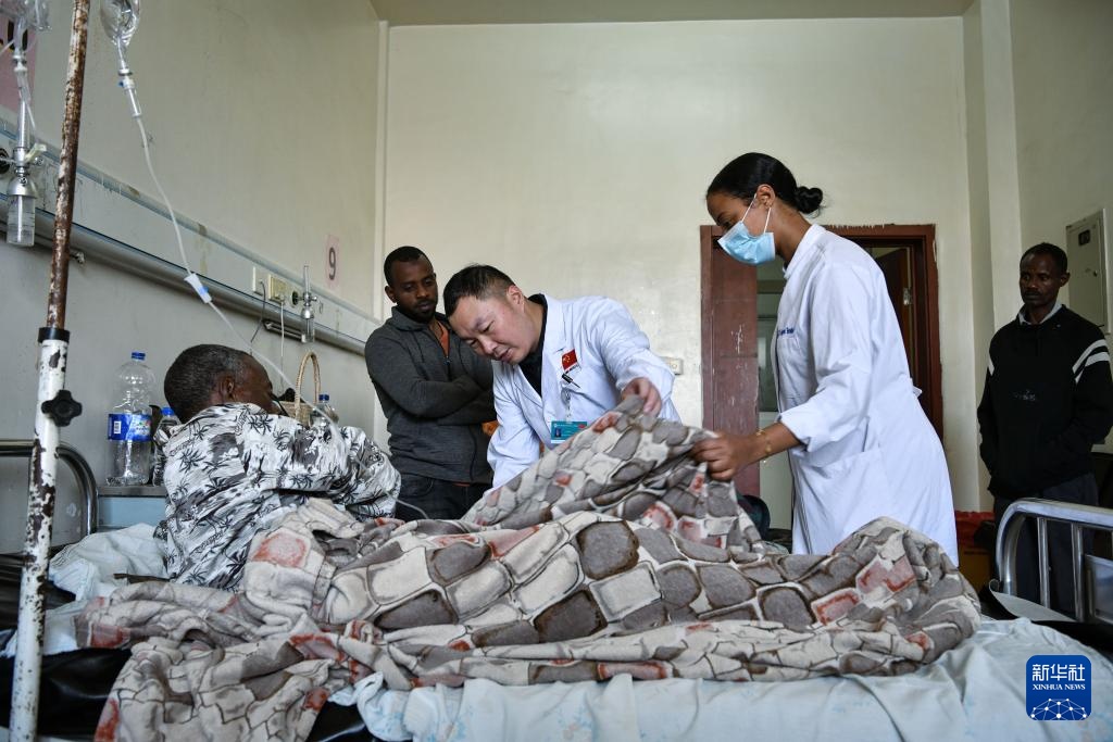 2月14日,在位于埃塞俄比亚首都亚的斯亚贝巴的蒂鲁内什-北京医院,中方泌尿外科医生李浩和当地医护人员在病房检查一名术后患者恢复情况。新华社记者 韩旭 摄