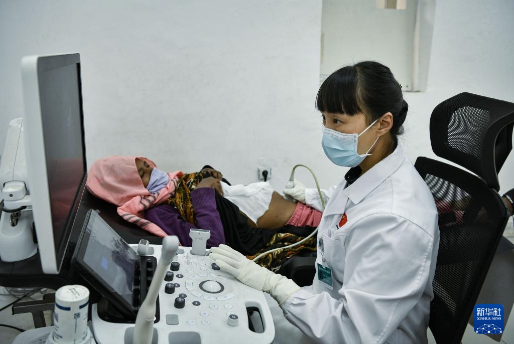 2月14日,在位于埃塞俄比亚首都亚的斯亚贝巴的蒂鲁内什-北京医院,中方超声科医生李娟为患者做检查。新华社记者 韩旭 摄