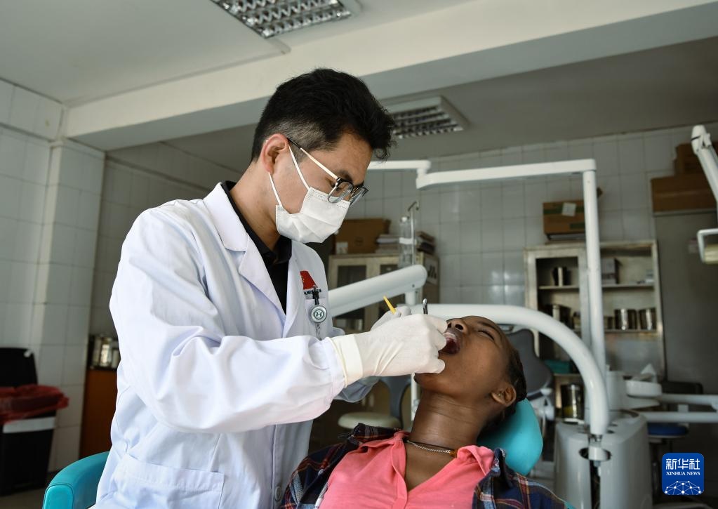 2月14日,在位于埃塞俄比亚首都亚的斯亚贝巴的蒂鲁内什-北京医院,中方口腔科医生高崇为患者做检查。新华社记者 韩旭 摄